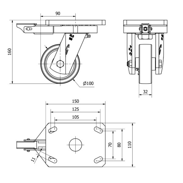 Rueda nylon-poliamida giratoria con bloqueo direccional Alex diametro 100 mm. modelo 2-3375