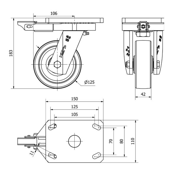 Rueda nylon-poliamida giratoria con bloqueo direccional Alex diametro 125 mm. modelo 2-3377