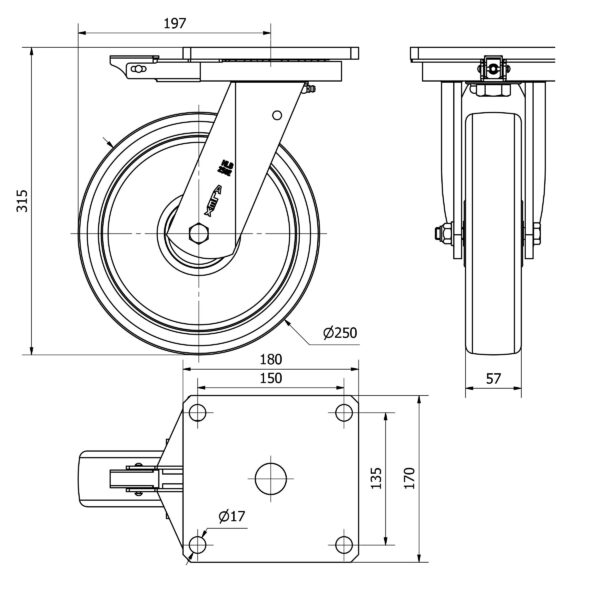 Rueda nylon-poliamida giratoria con bloqueo direccional Alex diametro 250 mm. modelo 2-3385