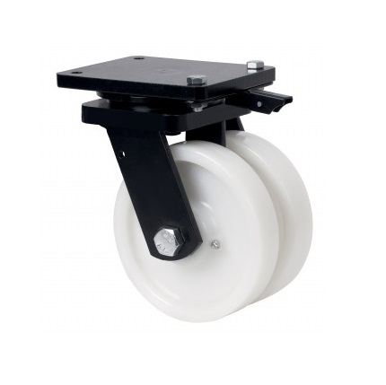 Las ruedas Alex serie HLG-FT son ruedas dobles de nylon extrafuerte, indicadas para soportar altas cargas hasta 2.500 Kg. Se utilizan en útiles de transporte logístico, grúas que transportan materiales pesados, así como plataformas elevadoras y gradas móviles, principalmente en el sector aeronáutico, ferroviario y automoción. FT: Ruedas especialmente indicadas para aplicaciones en industrias alimentarias y químicas. No manchan el suelo. Extrafuertes. Alta resistencia a golpes y choques.