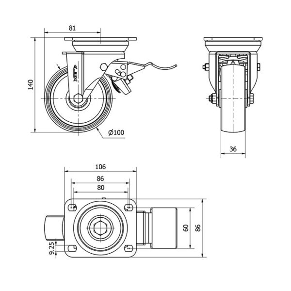Rueda nylon-poliamida giratoria con freno Alex diametro 100 mm. modelo 2-1618