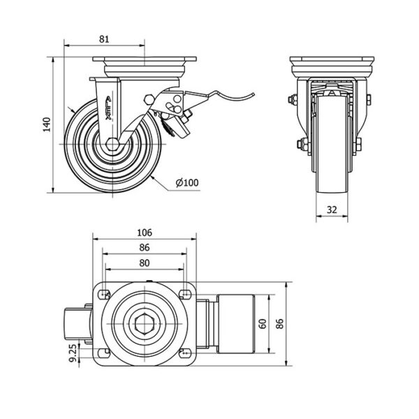 Rueda nylon-poliamida giratoria con freno Alex diametro 100 mm. modelo 2-1821