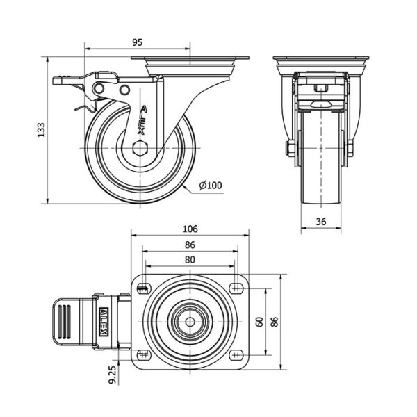 Rueda nylon-poliamida giratoria con freno Alex diametro 100 mm. modelo 2-2696