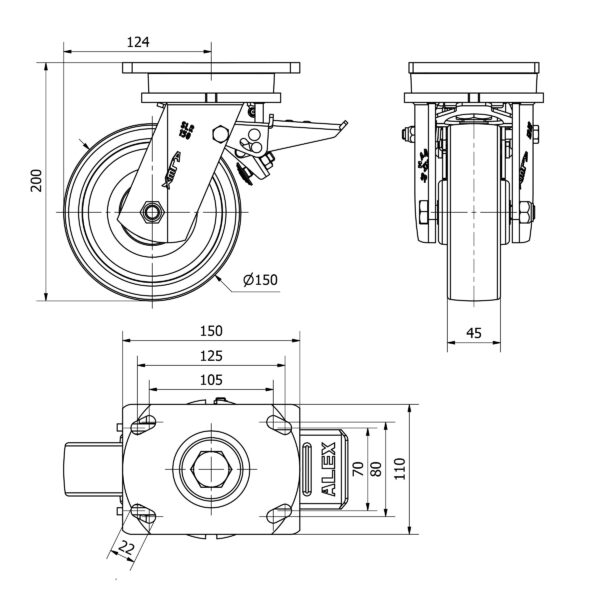 Rueda nylon-poliamida giratoria con freno Alex diametro 150 mm. modelo 2-3677