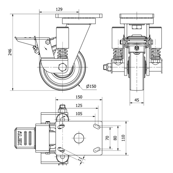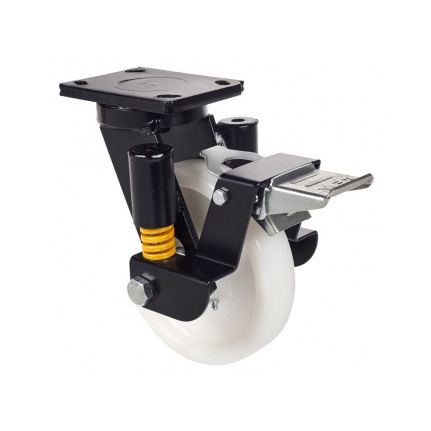 Las ruedas Alex serie HLS-FT son ruedas de nylon extrafuerte, indicadas para soportar altas cargas hasta 1.250 Kg. Con soporte de suspensión elástica, mediante incorporación de muelle muy resistente, ideal para suelos irregulares donde su amortiguación actúa. Se utilizan en útiles de transporte logístico, aéreas de exteriores, gradas móviles, plataformas elevadoras, carros de transporte, maquinaria pesada del sector de la construcción y grúas móviles. FT: indicadas para aplicaciones en industrias alimentarias, químicas y conserveras. No manchan el suelo. Extrafuertes.
