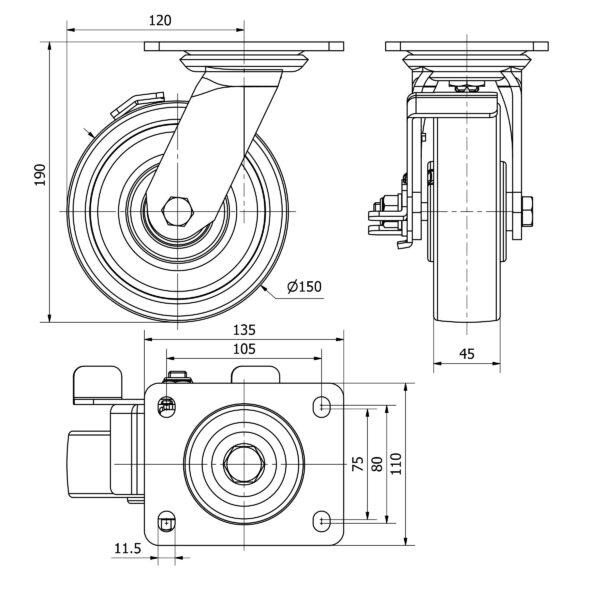 Rueda nylon-poliamida giratoria con freno Alex diametro 150 mm. modelo 4-1620