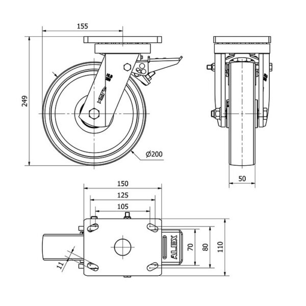 Rueda nylon-poliamida giratoria con freno Alex diametro 200 mm. modelo 2-1512