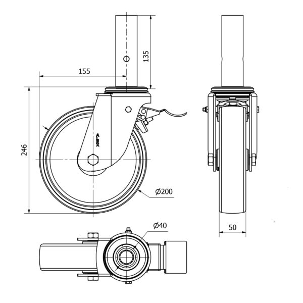 Rueda nylon-poliamida giratoria con freno Alex diametro 200 mm. modelo 2-2494