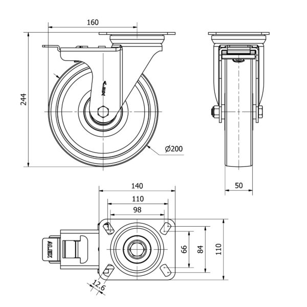 Rueda nylon-poliamida giratoria con freno Alex diametro 200 mm. modelo 2-3887