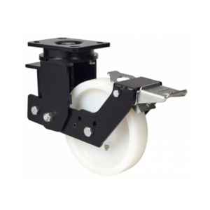 Las ruedas Alex serie HLSB-FT son ruedas de nylon extrafuertes, indicadas para soportar altas cargas de hasta 1.000 Kg. Con soporte de suspensión elástica, mediante la incorporación de un muelle muy resistente para absorber golpes, choques y desniveles. Recorrido de suspensión hasta 25 mm., ideal en suelos irregulares donde su amortiguación actúa. Se utilizan en útiles de transporte logístico, gradas móviles, plataformas elevadoras, carros de transporte, maquinaria pesada del sector de la construcción y grúas móviles. FT: indicada para aplicaciones en industrias alimentarias y químicas. No mancha el suelo. Extrafuerte. Indeformable. Fácil desplazamiento con carga.