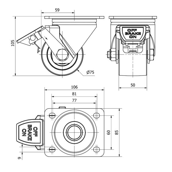 Rueda nylon-poliamida giratoria con freno Alex diametro 75 mm. modelo 2-4550
