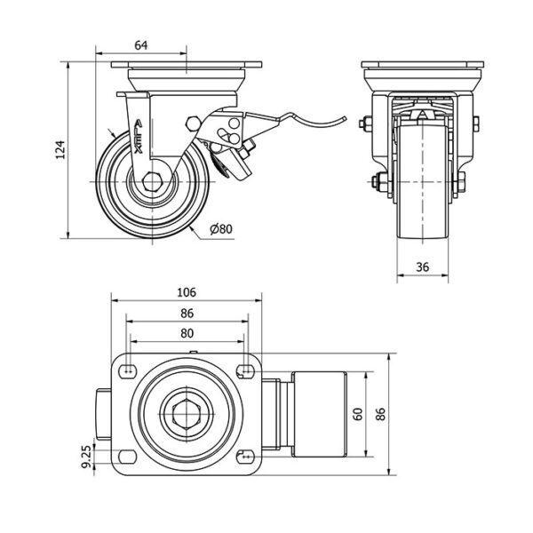 Rueda nylon-poliamida giratoria con freno Alex diametro 80 mm. modelo 2-1819