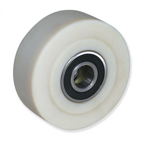 PO: Monobloque de poliamida extrusionada de color blanco-crema. Se obtienen por un proceso de extrusión -vertido sin presión en moldes (de poliamida fundida)- y enfriamiento controlado, consiguiendo un material mucho más resistente que la poliamida inyectada, al evitar las tensiones internas en el material que provoca el proceso de inyección. Banda de rodadura dura (85°Shore D). Ruedas de muy alta capacidad de carga. Baja resistencia a la tracción. Son resistentes a la corrosión, a los agentes atmosféricos, al envejecimiento y al desgaste. Requieren un mínimo de lubrificación y mantenimiento. Su resistencia química es excelente y el material no se ve afectado por el agua, la sal, aceites, grasas, disolventes orgánicos, hidrocarburos, productos petrolíferos, jabones, detergentes, álcalis, leche, etc. Soportan temperaturas de -30°C. a +80°C., su mejor campo de utilización se sitúa entre +5°C. a +40°C.