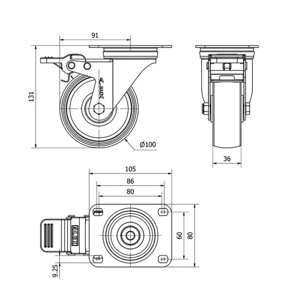 Rueda poliamix giratoria con freno Alex diametro 100 mm. 2-0158