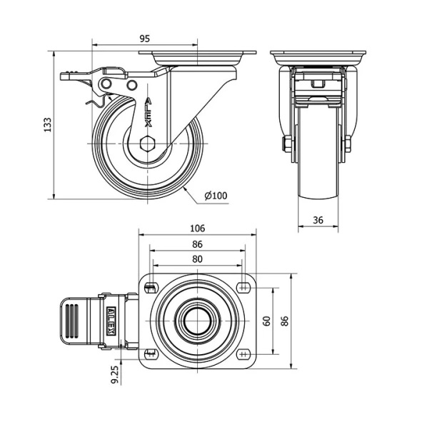 Rueda poliamix giratoria con freno Alex diametro 100 mm. 2-0170