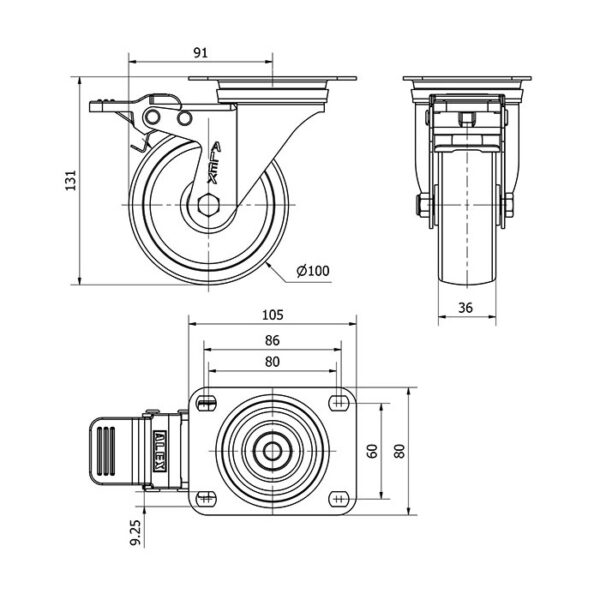Rueda poliamix giratoria con freno Alex diametro 100 mm. modelo 2-1837