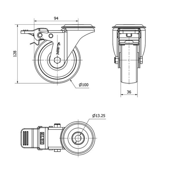 Rueda poliamix giratoria con freno Alex diametro 100 mm. modelo 2-2804