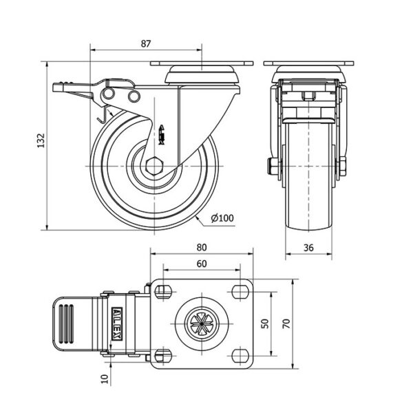 Rueda poliamix giratoria con freno Alex diametro 100 mm. modelo 2-4797