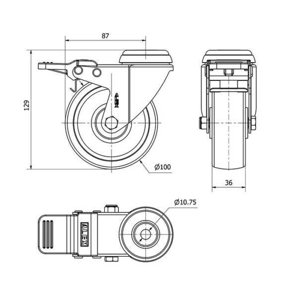 Rueda poliamix giratoria con freno Alex diametro 100 mm. modelo 2-4799