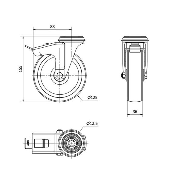 Rueda poliamix giratoria con freno Alex diametro 125 mm. modelo 2-3091