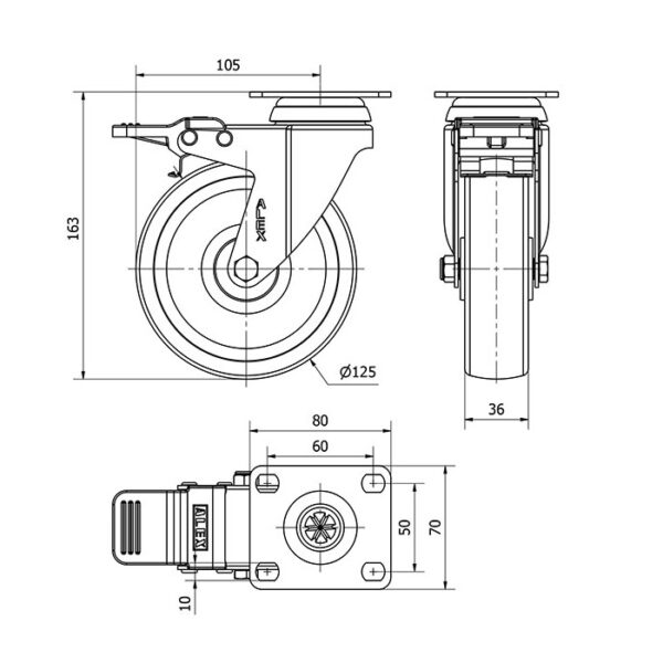 Rueda poliamix giratoria con freno Alex diametro 125 mm. modelo 2-4803