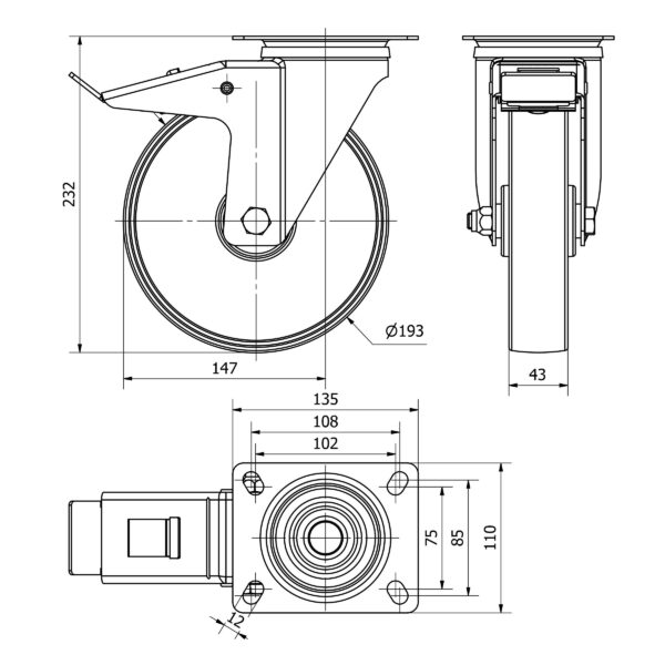 Rueda poliamix giratoria con freno Alex diametro 200 mm. modelo TW0210