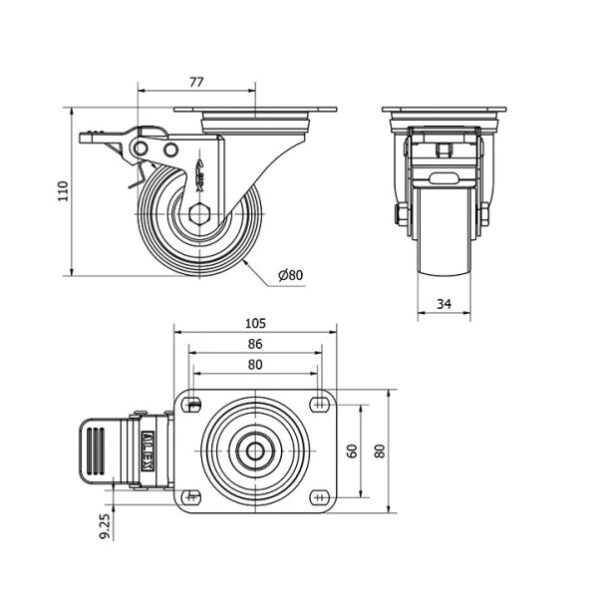 Rueda poliamix giratoria con freno Alex diametro 80 mm. 2-0151