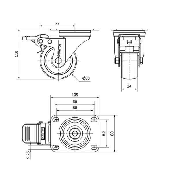 Rueda poliamix giratoria con freno Alex diametro 80 mm. modelo 2-2340