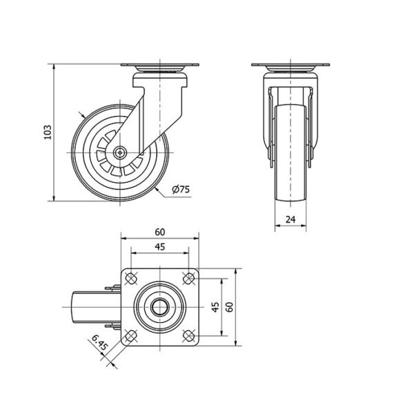 Rueda policarbonato giratoria Alex diametro 75 mm. modelo 1-0513