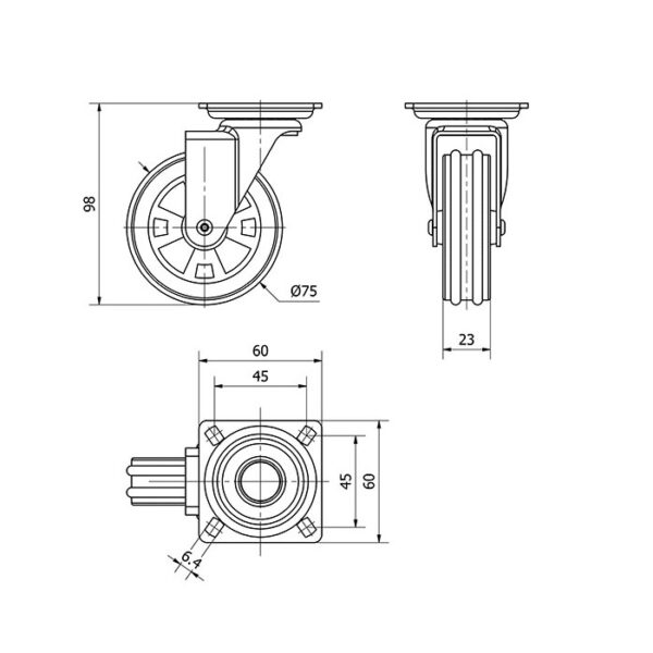 Rueda policarbonato giratoria Alex diametro 75 mm. modelo 1-0525