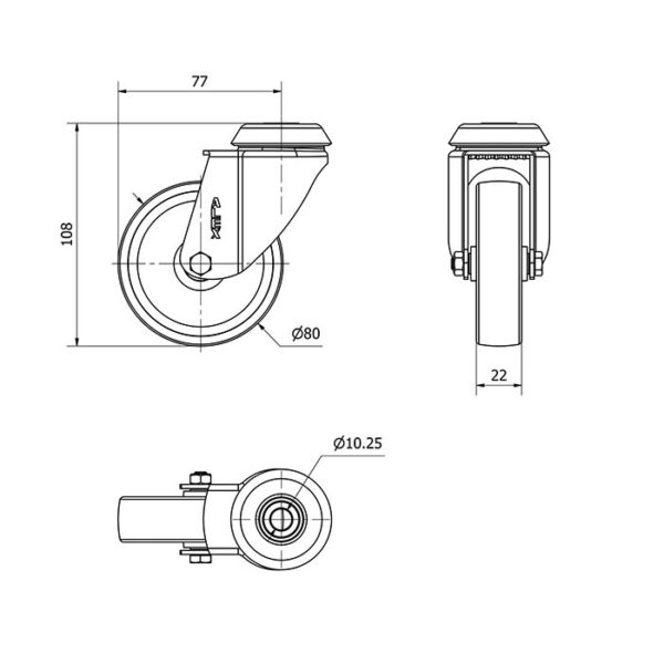Rueda policarbonato giratoria Alex diametro 80 mm. modelo 2-2147
