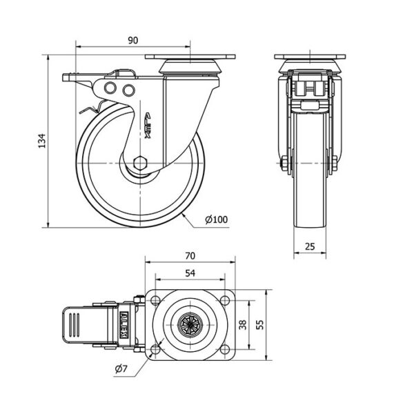 Rueda policarbonato giratoria con freno Alex diametro 100 mm. modelo 2-2144
