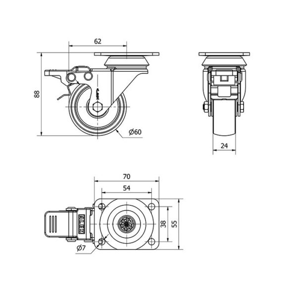 Rueda policarbonato giratoria con freno Alex diametro 60 mm. modelo 2-4808