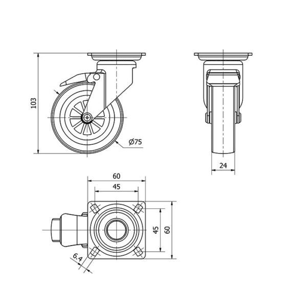 Rueda policarbonato giratoria con freno Alex diametro 75 mm. modelo 1-0522