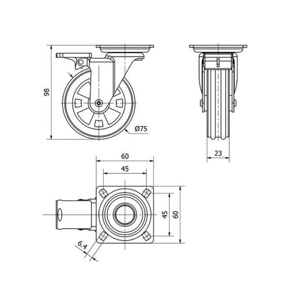 Rueda policarbonato giratoria con freno Alex diametro 75 mm. modelo 1-0530