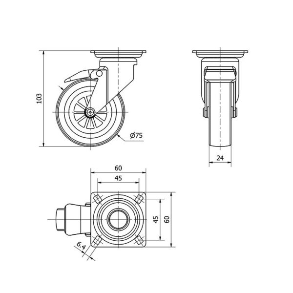 Rueda policarbonato giratoria con freno Alex diametro 75 mm. modelo 1-0612