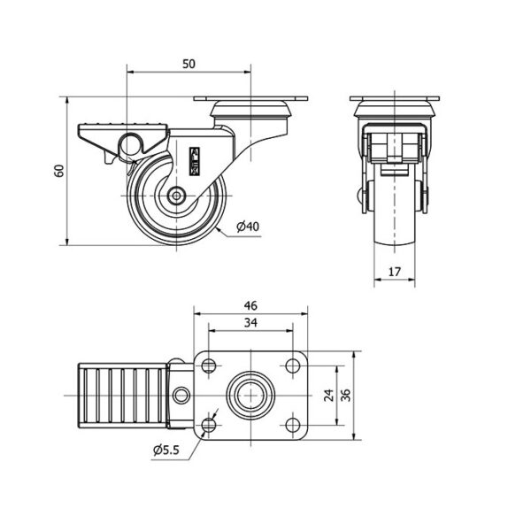 Rueda polipropileno-plastico giratoria con freno Alex diametro 40 mm. modelo 1-0722 EAN 8422202107226