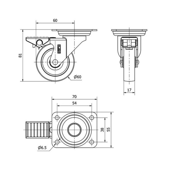 Rueda polipropileno-plastico giratoria con freno Alex diametro 60 mm. modelo 1-0724