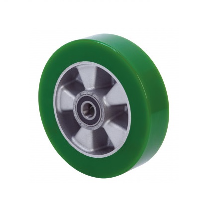 La serie de aros Alex AUGB son de poliuretano fundido verde con dureza de banda de 80º shore A y gran capacidad de carga y de absorción de golpes. Es silenciosa y respetuosa con el suelo.