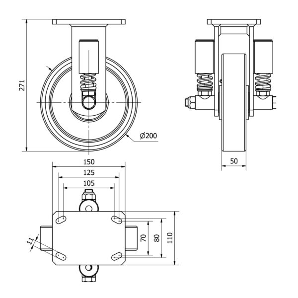 Las ruedas Alex serie HLS-HU son ruedas con el núcleo de acero y con la banda de gpoliuretano fundido con dureza de 95? shore A, indicadas para soportar altas cargas hasta 1.250 Kg. Con soporte de suspensión elástica, mediante incorporación de muelle muy resistente, ideal para suelos irregulares donde su amortiguación actúa. Se utilizan en útiles de transporte logístico, aéreas de exteriores, gradas móviles, plataformas elevadoras, carros de transporte, maquinaria pesada del sector de la construcción y grúas móviles. HU: alta absorción de golpes. Condiciones de pavimento desfavorables. Superficies rugosas, quebradas, con virutas metálicas, manchas de aceite, cristales, grasas y grava.