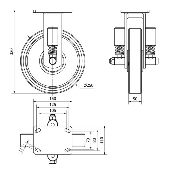 Las ruedas Alex serie HLS-HU son ruedas con el núcleo de acero y con la banda de gpoliuretano fundido con dureza de 95? shore A, indicadas para soportar altas cargas hasta 1.250 Kg. Con soporte de suspensión elástica, mediante incorporación de muelle muy resistente, ideal para suelos irregulares donde su amortiguación actúa. Se utilizan en útiles de transporte logístico, aéreas de exteriores, gradas móviles, plataformas elevadoras, carros de transporte, maquinaria pesada del sector de la construcción y grúas móviles. HU: alta absorción de golpes. Condiciones de pavimento desfavorables. Superficies rugosas, quebradas, con virutas metálicas, manchas de aceite, cristales, grasas y grava.