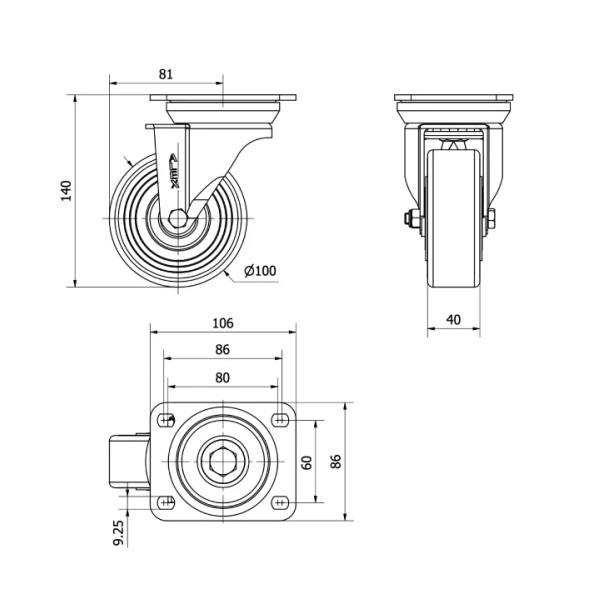Rueda poliuretano giratoria Alex diametro 100 mm. 2-0393