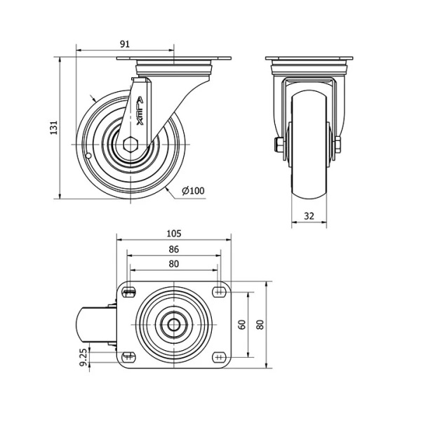 Rueda poliuretano giratoria Alex diametro 100 mm. 2-0513