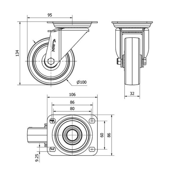 Rueda poliuretano giratoria Alex diametro 100 mm. modelo 2-2314