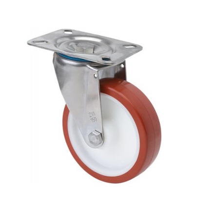 La serie de ruedas Alex ZVI INOX-POL son de poliuretano inyectado, con todos sus componentes de acero inoxidable (AISI-304), indicadas para soportar cargas hasta 300 Kg. Se utilizan en exteriores, carros de transporte de alimentación, cantinas, comedores, restaurantes, empresas de alimentación, máquinas de embalajes, cintas transportadoras, construcciones inoxidables, maquinaria ligera para la construcción, contenedores, jaulas de transporte, granjas avícolas, químicas, cadenas alimentación, frigoríficos, arcones y congeladores. POL: Gran duración sin desgaste. Alta resistencia a los aceites y grasas. Silenciosas, limpias e indeformables.