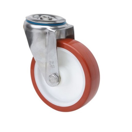 La serie de ruedas Alex ZVI INOX-POL son de poliuretano inyectado, con todos sus componentes de acero inoxidable (AISI-304), indicadas para soportar cargas hasta 300 Kg. Se utilizan en exteriores, carros de transporte de alimentación, cantinas, comedores, restaurantes, empresas de alimentación, máquinas de embalajes, cintas transportadoras, construcciones inoxidables, maquinaria ligera para la construcción, contenedores, jaulas de transporte, granjas avícolas, químicas, cadenas alimentación, frigoríficos, arcones y congeladores. POL: Gran duración sin desgaste. Alta resistencia a los aceites y grasas. Silenciosas, limpias e indeformables.