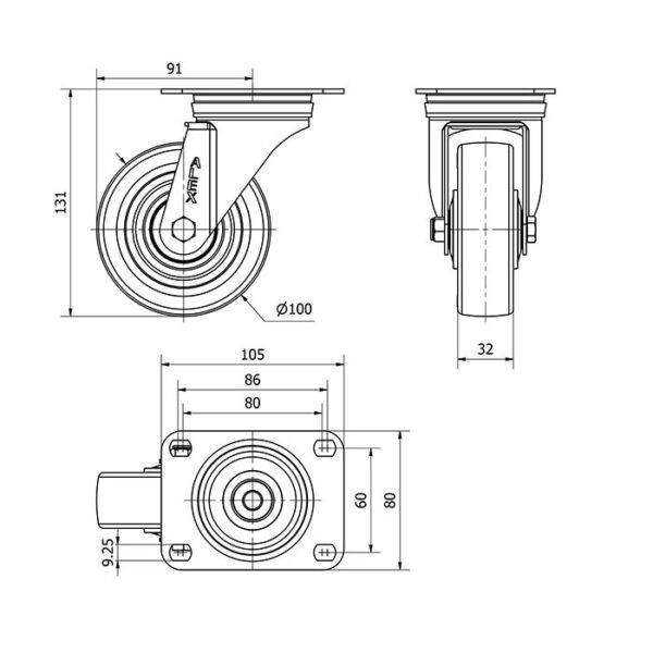 Rueda poliuretano giratoria Alex diametro 100 mm. modelo 2-4206