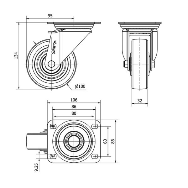 Rueda poliuretano giratoria Alex diametro 100 mm. modelo 2-4207
