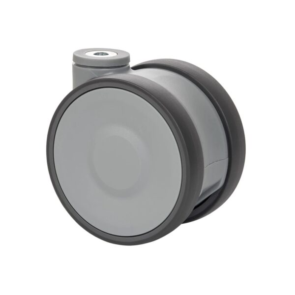 Rueda de poliuretano doble. Carcasa fabricada con fibra de vidrio reforzada en color gris. Soporte pivotante de fácil encaje. Cabezal giratorio con doble cojinete de bolas de precisión. Especialmente indicadas para soportar cargas de hasta 125 Kg.