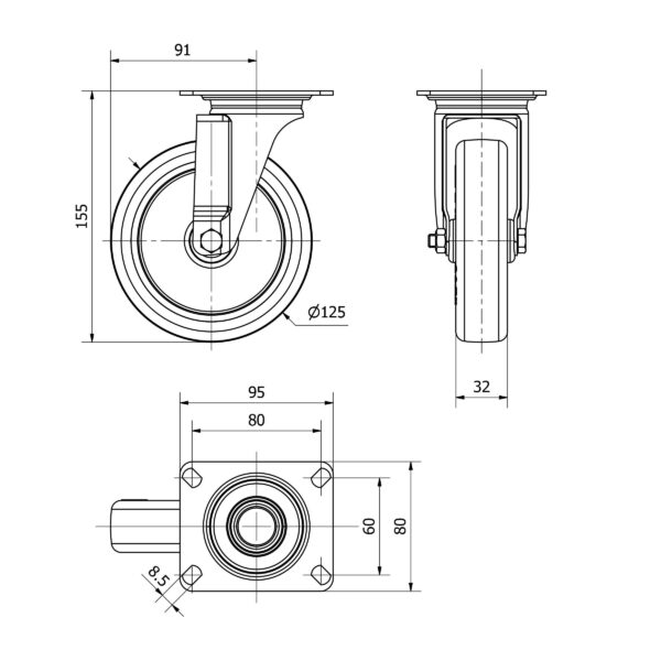 Rueda poliuretano giratoria Alex diametro 125 mm. modelo 2-3094